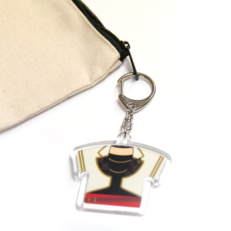 キーホルダーは全8種類でTシャツ型や丸型、長方形型などをご用意しております。